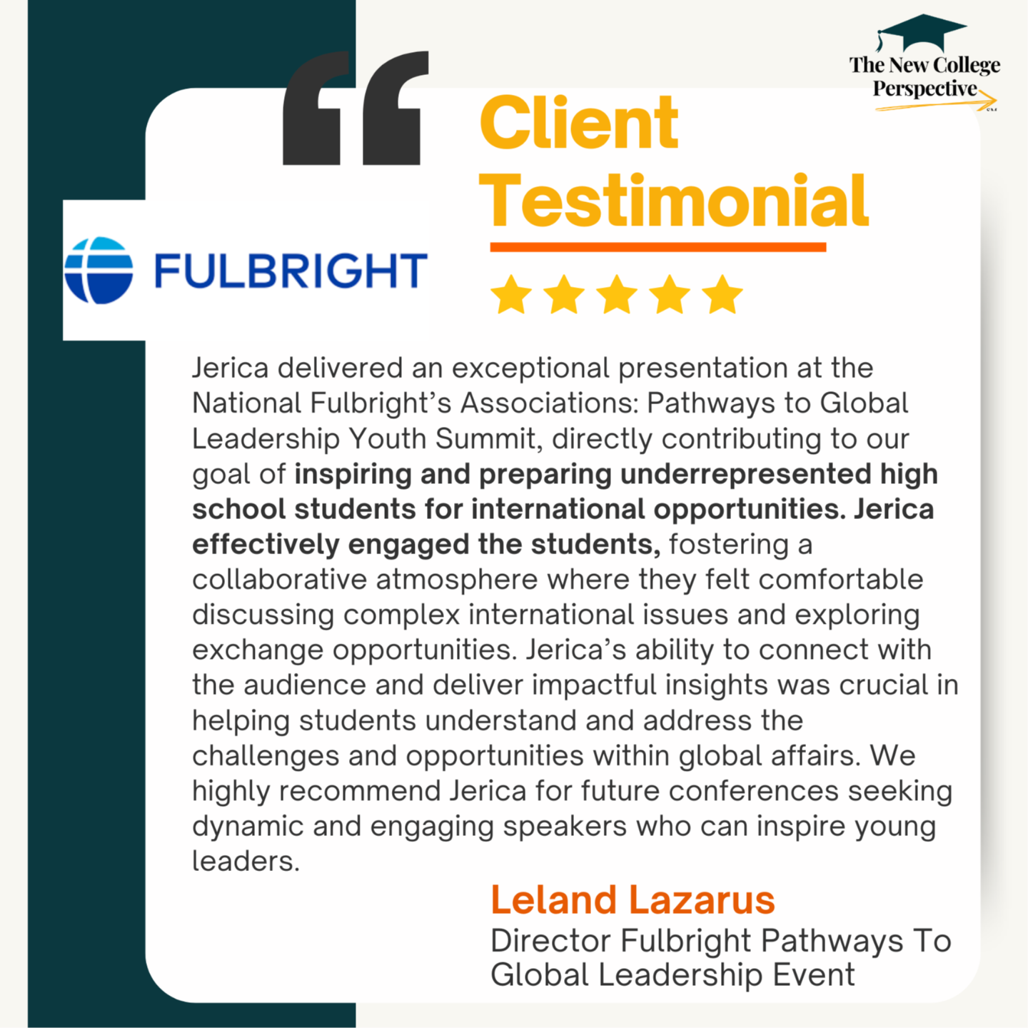After winning over $450,000 in scholarships to fund her own education, she founded The New College Perspective to help first-generation, second-generation, and underrepresented students access similar opportunities.  Jerica has been featured by the Fulbright Association for her work empowering students to pursue global education.